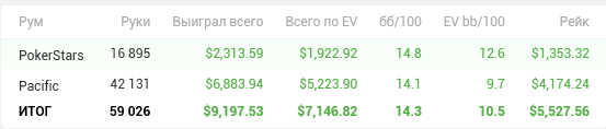 По месяцу сейчас 1в1 итог по бабкам и рукам, правда это после отката и по ев у меня 5к+ Раньше чаще тебя за столами видел, а тут пару-тройку раз всего за этот месяц. Но АА я тебе тем не менее успел оплатить Видимо твой ап сильнее моего, который был на начало месяца))) Удачи! будет интересно посмотреть, как пройдет твое подключение нл400.