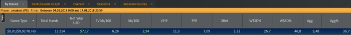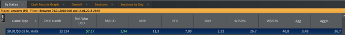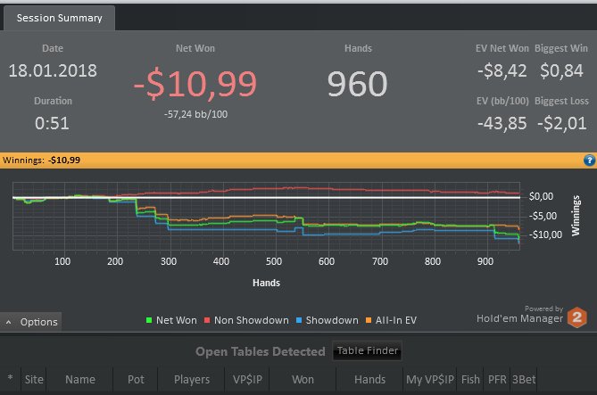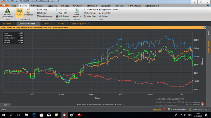 Результаты просто пиздец. Я хз, может в церковь сходить свечку поставить или ставить ебаный стоп-вин, чтоб скилл чуствовался за 300 рук = 5 у.е. потом буду бегать и рассказывать какой я крутой. Такое ощущение, что чем больше играешь, тем больше проигрываешь, ну это пиздец иметь за 14к = -$1.47, причем по ев все в норме. На сегодня если еще сделаю минус 1 БИ останавливаюсь, пойду в зумме попробую, сил терпеть эту хуйню уже нет.