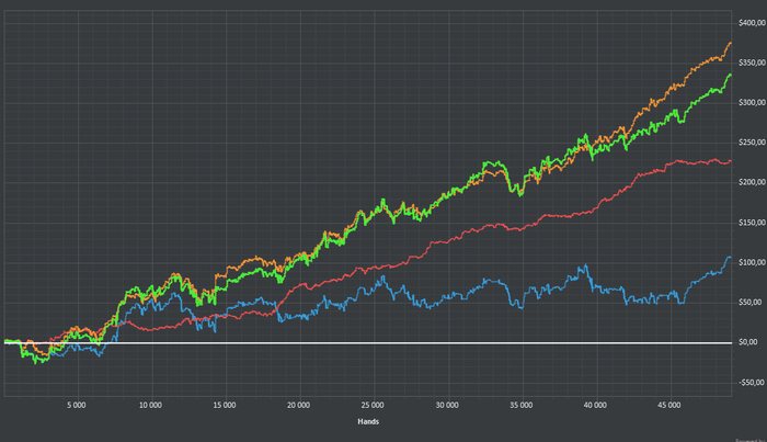 Агрессивно защищать эквити оказалось отличной стратой. Надо в фишей чаще пушить на дро флопах, они любят принимать.