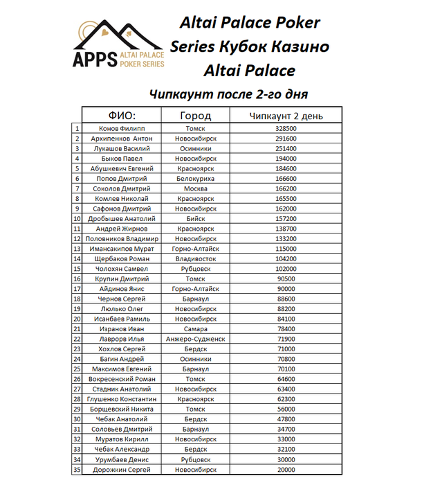 Доброго времени суток! Мы начинаем финальный день турнира "Кубок Казино Altai Palace". Поздняя регистрация закрыта. Финальный день начинает 40 игроков. Блайнды 2 500/5 000, анте 5 000. Всего сделано 138 входа. Призовой фонд составляет 18 009 у.е. Всем УДАЧИ!!!