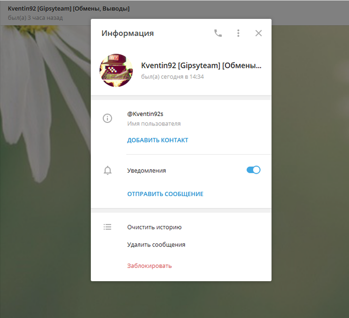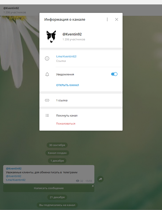 Kventin92 @ 14.10.2019 Будьте внимательно и осторожны! В телеграме от моего имени орудует мошенник под ником Kventin92s. Если сомневаетесь в том, что общаетесь именно со мной, напишите мне здесь в личные сообщения.
