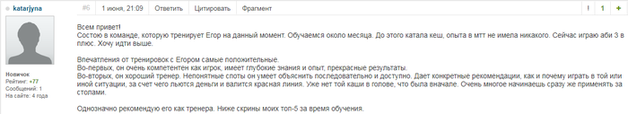 Да , двое суток вы занимались тем , что пытались доказать , что человек взявший деньги в долг , может его не возвращать , только потому ,что тренер не компетентен . Конкретно Вы , уважаемый , очень долго и упорно мусолили тему "фиктивных переводов" , хотя являясь человеком отнюдь не глупым и даже талантливым в определенных аспектах , не могли не понимать , что это был не верный оборот означающий - ошибочная проводка , но Вам было выгодно именно так преподносить это ,Вы зафлудили всю тему цитатами , нагнали тумана и заработали на этом рейтинг . Так вот , отвечаю Вам на вопрос - От куда вы появились ? Милейший , физиологически от туда от куда и Вы , я полагаю , а если говорим о теме , то в отличии от Вас я играю в покер и лично Вам поясню , что воскресения для турнирных игроков - ДНИ НАДЕЖД , в понедельник я тоже играл , сегодня у меня выходной и я решил наконец-то высказаться , простите накипело . По поводу тренера за которого я высказывался - за него мне говорить не надо , скажут результаты . О себе : За 5 лет у меня в рейтинге 0 мне не было интересно играть в +- , я писал , мне ничего от ДТ не нужно , окромя общения с единомышленниками ! Я с удовольствием буду общаться с Вами если Вы любите покер!
