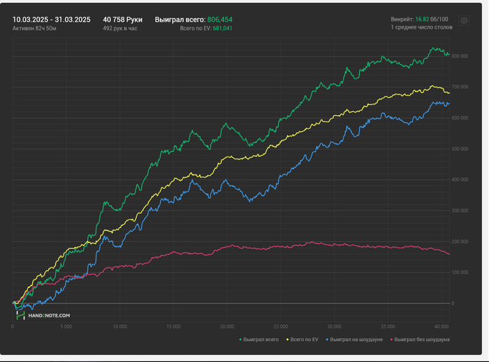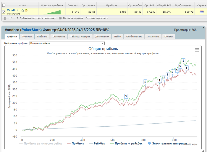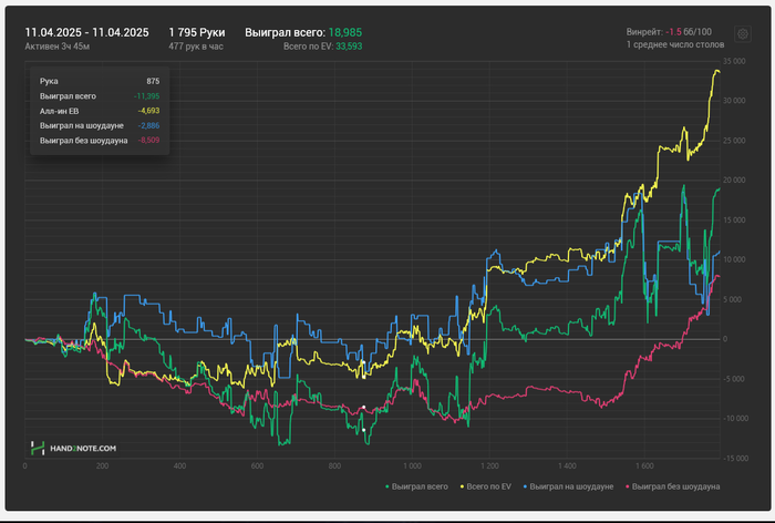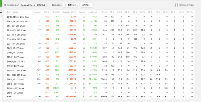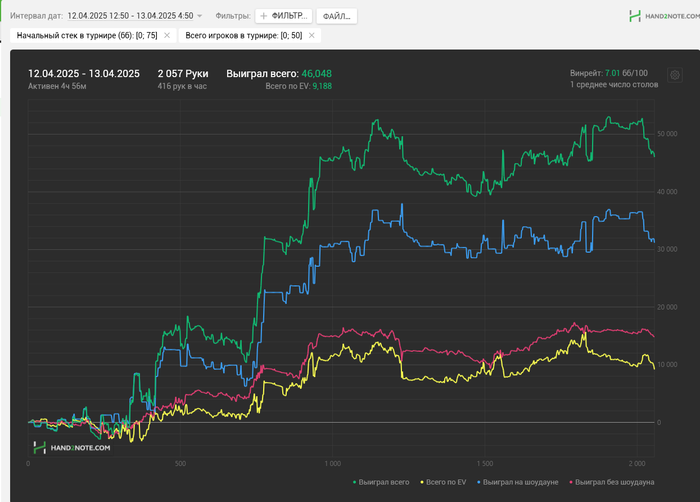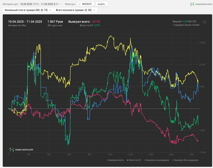 что то в послдение дни отыгрываю мало, чувствую нужно отдохнуть нету какого то заряда ебашить. На следующей неделе начну раскидывать долги те что отсались бр уже позволяет. Для полного отчёта ещё рановато в конце месяца так же отпишу кол турниров профит с учётом выводов ну и график. Сегодня вроде бы отыграл хорошо а по графику ев так себе ну хотя о чём тут говорить 15 турниров отыграно.