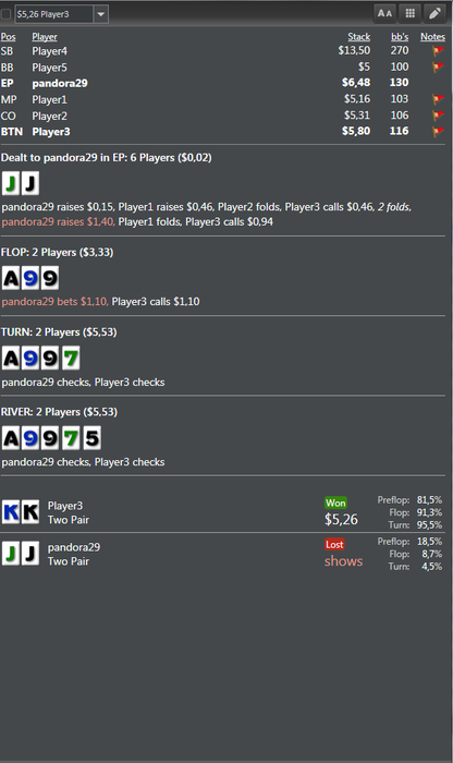 Jeime_Lan, по первой раздаче согласен,а по второй ну он понимает что я капнут,но я могу QQ тоже так сыграть , я дал ему предполагаемый диапазон AA KK и иногда увидим там A5s