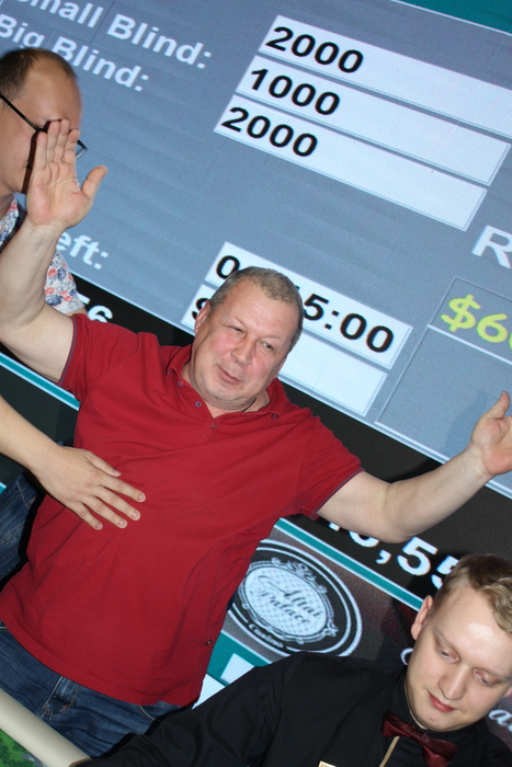 Чипкаунт финального стола Кубка Казино АП: Максимов Евгений 255К; Тарновский Павел 267К; Айдинов Янис 338К; Медведев Сергей 293К; Куманеев Георгий 470К; Белов Сергей 554К; Мезенцев Олег 60К; Конев Михаил 288К.