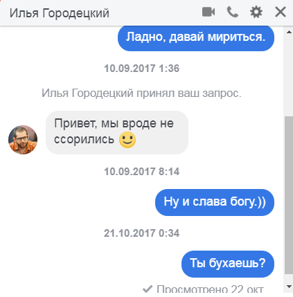 Так вот, я никому ничего не навязываю, люди сами у меня спрашивают. Я им говорю, что думаю, а они либо принимают, либо отворачиваются. Для этого и есть группа. Если человеку не подходят мои взгляды, он просто выходит из неё. Однако, желающих туда попасть ГОРАЗДО больше, чем мест.
