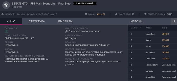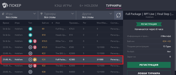 А уже в 21:00 по МСК стартует долгожданный финальный сателлит с байином 26 евро. Продолжаем отбираться в престижный Главный турнир серии.