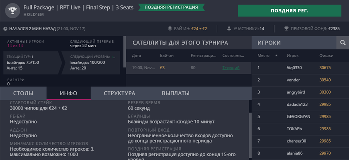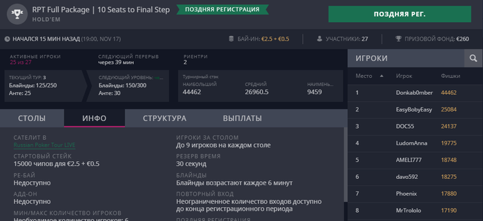 В финальном сателлите на RPT Main Event на данный момент 25 регистраций, 17 в игре. Поздняя регистрация - до конца 15 уровня, стартовый стек - 30 000 фишек, идет шестой уровень! Продолжаем отбираться в один из самых престижных турниров серии, регистрируемся!