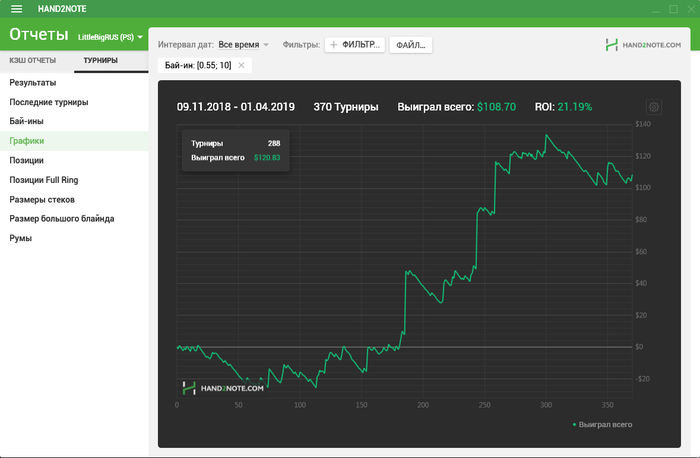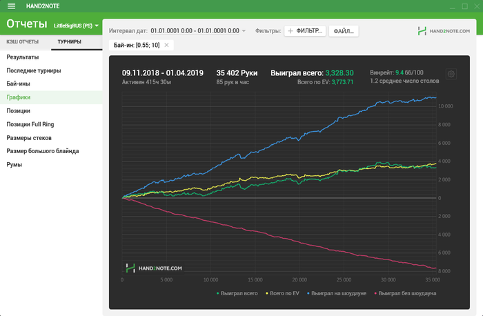 repbel666, Да,я не спорю,ты прав, я не могу тут ничего сказать так как я играю в покер поскольку постольку (пока)!играю только 1$ 45 тел и МТТ за 1.10 редко 2.20!и с того момента как я установил H2N прошло всего 370 туриков,это мало я знаю и график не особо прикольный поэтому и заинтересовался этим и напрягло немного!