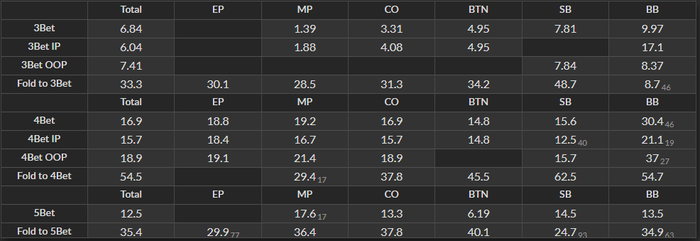 1,2) попробуй играть без коллов 4бета, хорошая страта, кстати. 3) сложно сказать без инфы, какой диапазон он коллирует, как сдается на контбеты. Чек -рейз не рассматривал по флопу или терну в его слабый диапазон? 4) карманки не отвалятся если поставишь флоп, тут по любому надо ставить, только не много. 5) почему ты не пользуешься статами рейнджа 4бет и 5бета? Намного удобнее определять рейндж. Хороший фолд, у него рейндж 5бета получается 1% и фолд на 4бет высокий, КК ты блочишь, там остаются только АА.
