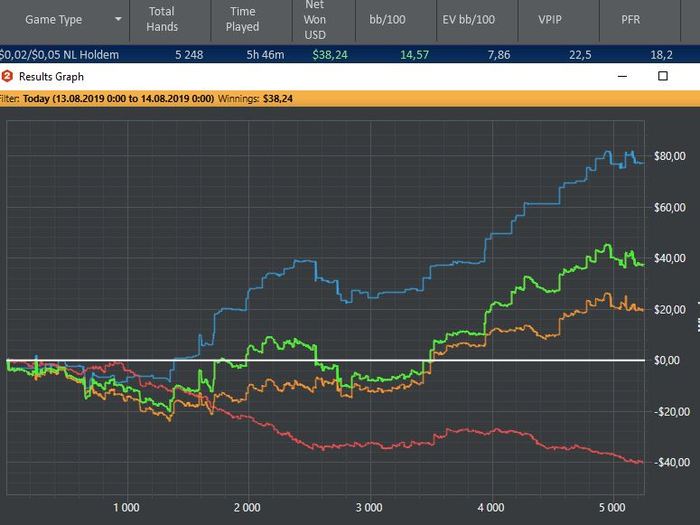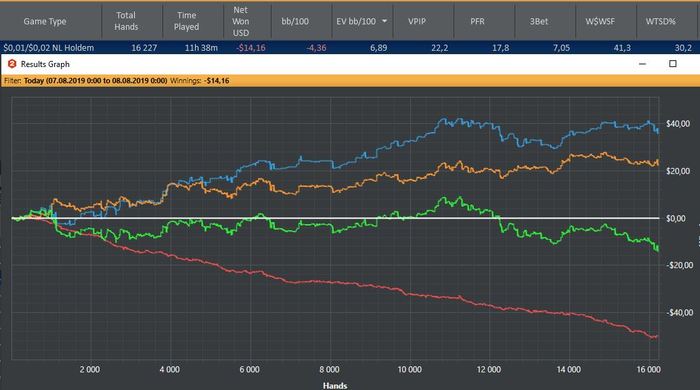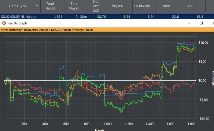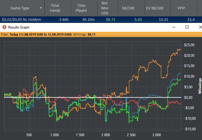 11.08.19 Много рук наиграть не получится сегодня-пригласили на др.Играю рег столы, стараюсь не раздувать банки без эквити, не забывая про красную. Пока результат удовлетворяет. Еще бы гсч не прикалывалось)