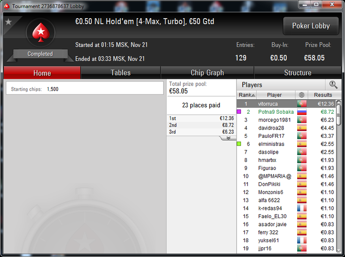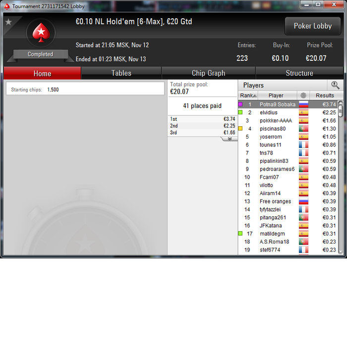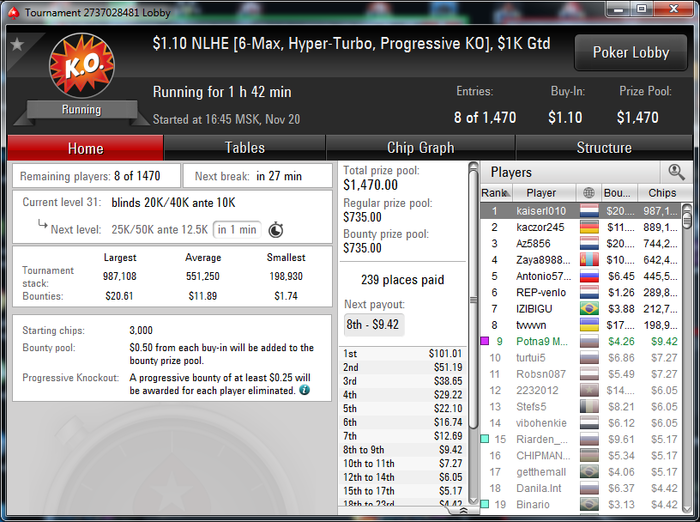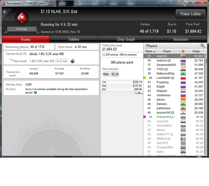 Первая сессия в ноябре была за здравие,вторая за упокой 12.10.2019 ps.es -6.27 sochi -33.26 Гружу мысленно не больше 10% от общего БРа на руме Начал катать МТТ по 1.1 ,прыгал в поздние реги стек 25-40бб,делал 1-2 рентри,или в основном 1,если не складывалось сразу(точно не помню). Попробовал Микромиллионс,тоже прыгнул со второго 2 раза очень удачно,раскрутил стек,был примерно 100 из 1к оппов(100бб+)и потом 1 раздача и давай досвидание,показать не могу ибо турик почему не сохранился,но забавная Вообще с самого начала я прикола не понял,хада нету,старс кепшен не пашет и карт не видно,типо в угадайку играй)