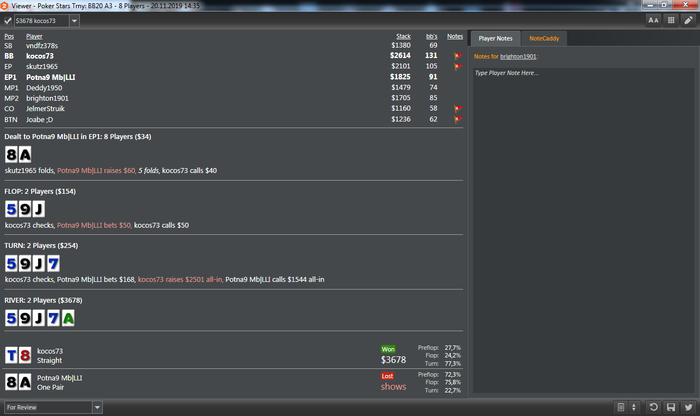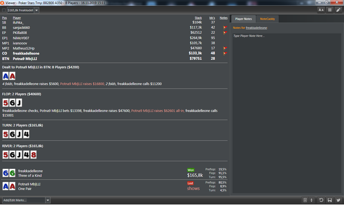 16.11.2019 ps.es +3.19 sochi -6.93 Вообще Ноябрь месяц обучения/теории и прочей лабуды.Игра/теория - 40/60. Не думаю что это плохо,да,конечно дистанция сильно хромает,но ничего не поделать. Сегодня катал 4 стола,думаю продолжу эту задумку,нужно внедрить спектры которые выучил(Def BTN 16-25bb/Def BTN 26-45bb против различного RFI). Много разбираю,мб когда-нибудь мне начнет это нравится Было пару небольших дипранчиков