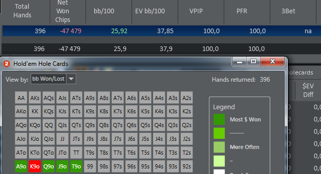 1.Проверил UO PFR % по стилящим позам CO/BTN/SB, чуть затронул MP Начал с MP интересовали 87s/98s 27 рук(ситуаций) в 4 из них сыграл не оптимально,еще пару рук должен был запушить,остальное пойдет. --Open CO.Тут писанины было много больше.131 рука,111 из них должен был открывать,каждую отдельно просматривал и выписывал Самые косячные руки(которые больше всех не открыл) 1)109о - 13 2)J9о - 8 3)45s - 7 4)64s - 6 5)75s - 5 6)K9о - 5 7)A2о - 5 8)96s - 4 9)Q9о - 4