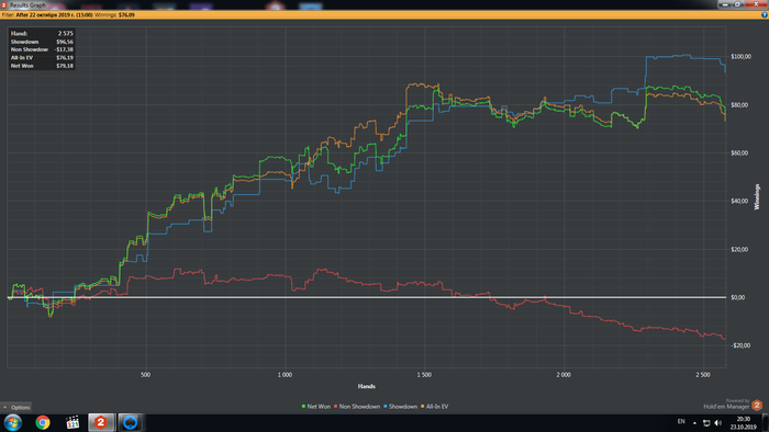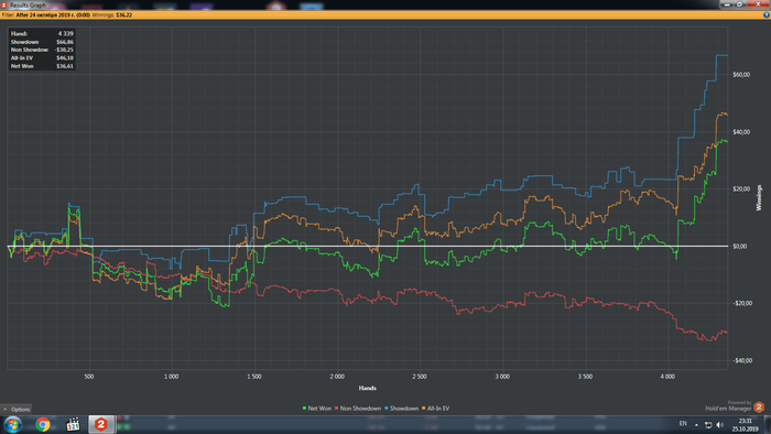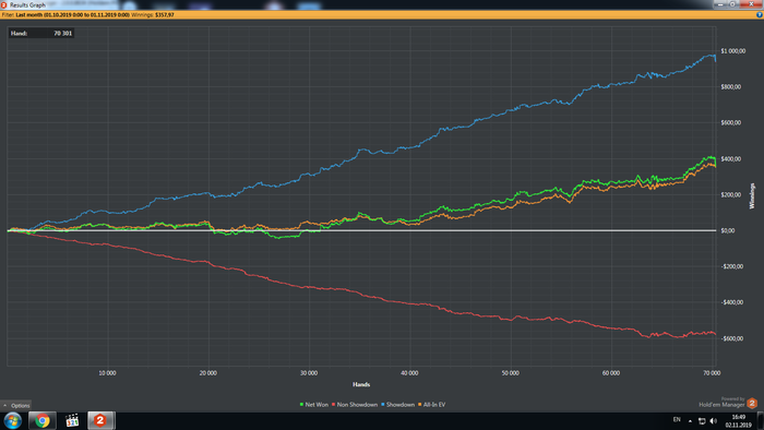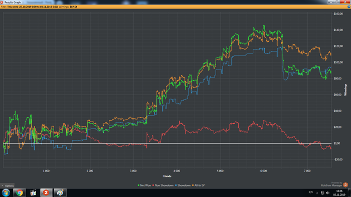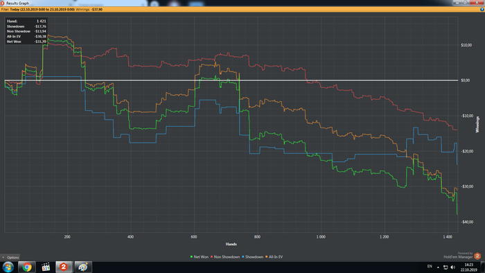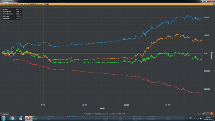 Немного подвыбило из рабочего настроя. Проблема с компом все это время были связаны с битыми секторами на жестком диске , купил на авито б у жесткий диск, он вылетел после второго включения... Пока проблемка не решится, мое железо позволит катать только зум. Специфику снап поляны на 888 немного понял и подстроил игру под нее, увеличил трибет до 11% и поливаю в опасные карты подходящие моему диапазону, т.к рейкбека практически нету, оппоненты склоны играй более тайтовей. Решил откатать в снапе небольшой марафон, за 11 дней сыграть 35к раздач минимум до 13 ноября. Цель в профите ставить не буду , только по красной в линии отыграть в ноль или плюс. График за эту неделю: