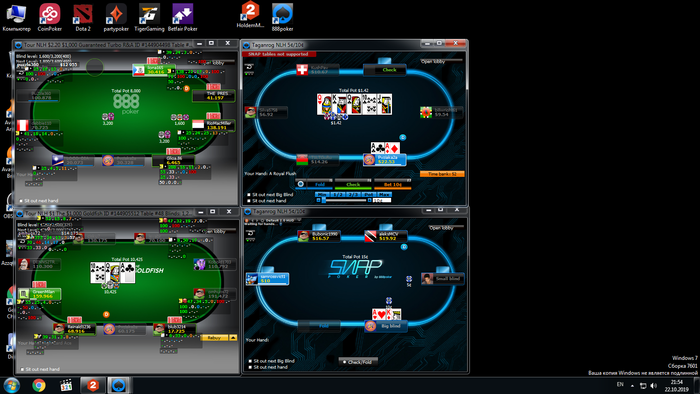 В следующий раз подумаю несколько раз, прежде чем бухнуть, когда плотно занимаюсь покером. Как будто подменили после застолья, пропала куда то вся мотивация и энергия. Очень недоволен своим настроем на игру, появился автопилот и игра в кнопки, благо просто апает и можно позволить не бороться за банки.