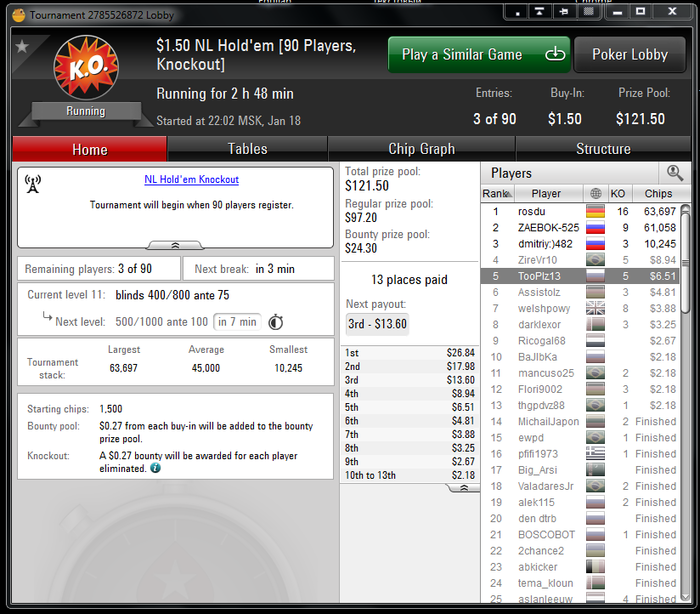 Пока сдаю экзамены, играю немного . Акция на пати насыпала сегодня 8 баксов и баксво 10 выиграл в зуме нл 2 пока набивал для неё рейк. Решил 1 турик за бакс грузануть, чуть отморозился в топ 5 , но не страшно результат норм.