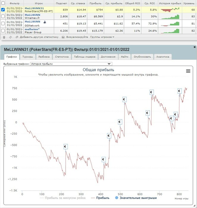 Европейские Старзы: здесь все просто. Сыграл примерно 840 турниров на АБИ 15$ с общим РОЕм 5%, т.е плюс 750$.