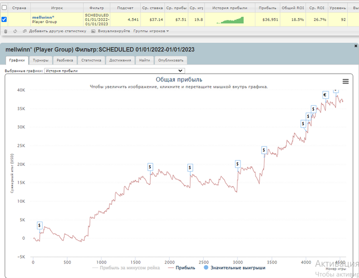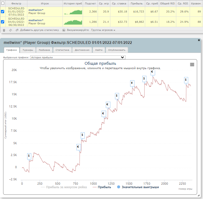 Всем привет. Пролетело полгода и время подвести итоги. За 6 месяцев 2022 года сыграл около 2400 турниров на АБИ 33$. Прибыль составила 16700$, а общий РОЙ 20%. В целом так примерно мною и ожидалось, по крайней мере рассчитывал на это.