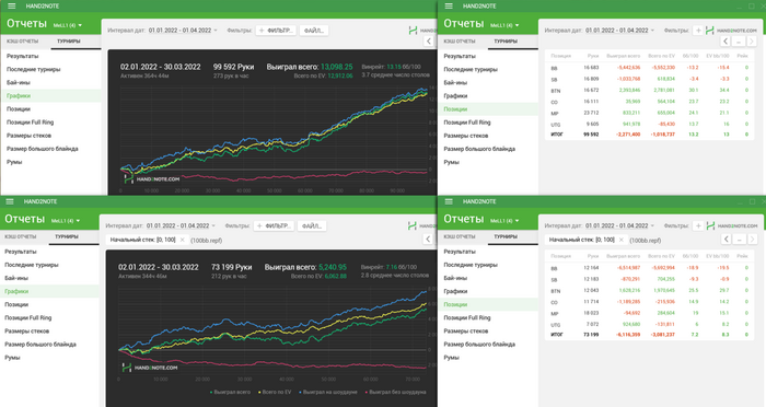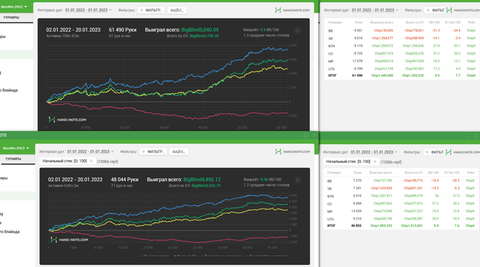 Винрейты (без учета GGПокерОК и Рartypoker): 13,2 бб/100; 13,0 евбб/100; с фильтром (100 блайндов и меньше): 7,2 бб/100; 8,3 евбб/100.