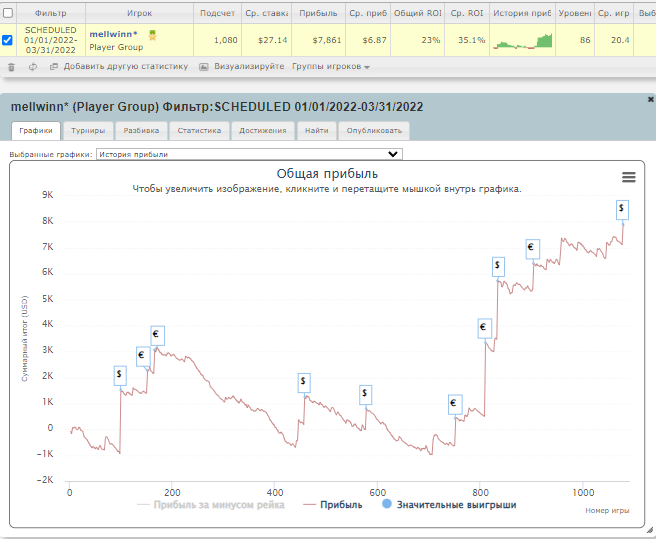 Решил отойти от привычного ежемесячного отчета и перейти на, так называемый, квартальный отчет с кратким пояснением, что было по месяцам. Итак, первый месяц текущего года в первые дни дал почву для оптимизма, мой профит к 20-м числам приближался к 3к $. Однако, как это часто бывает в покере, к концу месяца этот запас я растерял и пришел с около 700 $ профитом на начало февраля. Февраль весь месяц прошел, как бы, ни туда и ни сюда, денег не выйграл, но и сильно не закатал в минуса. К началу марта профит составлял около минус 500 $. Первый же день марта выдался удачным, свой минус я отыграл и профит пошел вверх. (хочу напомнить, что баснословных выйгрышей 10К $+, как бы на данном этапе своей карьеры мне не видать, так как у меня дневная сетка по МСК). К концу марта, а также первого квартала в целом, профит составил примерно 7800$. Таким образом, общий РОЙ составил 23%, отыграл 1080 турниров на АБИ 27$, если ссылаться на сайт sharkscope (по своим отчетам, которые я составляю ежедневно, то АБИ составляет 30$, куда деваются 3 бакса я не знаю, хотя дистанция и выигрыш выглядит более менее достоверно).