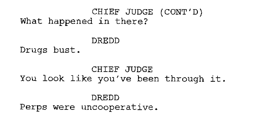 Дредд проходит через экстимально тяжелые сложности, несправедливость, но остается верен себе, враги уничтожаются, он побеждает ("примитивно" для современного "кино").
