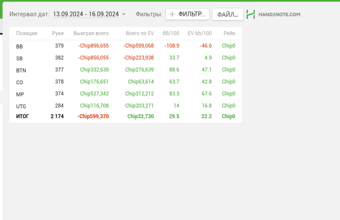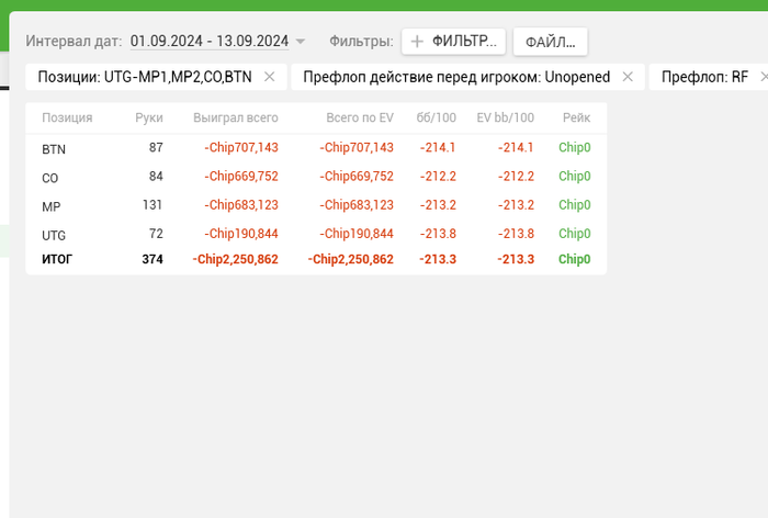 Из-за того, что фолдом на 3бет мы всегда играм в -213.3 ев\бб на 100, все что мы отыграем лучше этого показателя будет + игрой. Я отыгрываю данный спот в этом месяце в -123ев\бб на 100( смотрим первый скрин). Применяем базовые знания из математики и находим насколько лучше я сыграл через данный спот заколлировав 3бет: 213.3 - 123=90.3 т.е я сыграл в +90.3 ев\бб на сто. Означает ли это, что надо защищать все, что мы открыли? Однозначно - нет! Для защиты мы отталкиваемся от частоты 3бета оппонента, от позиций с которой мы открылись, силы своей руки, стадии турнира и если это пко(турнир с наградой за выбивание - баунти) то покрываем ли мы оппонента или нет.