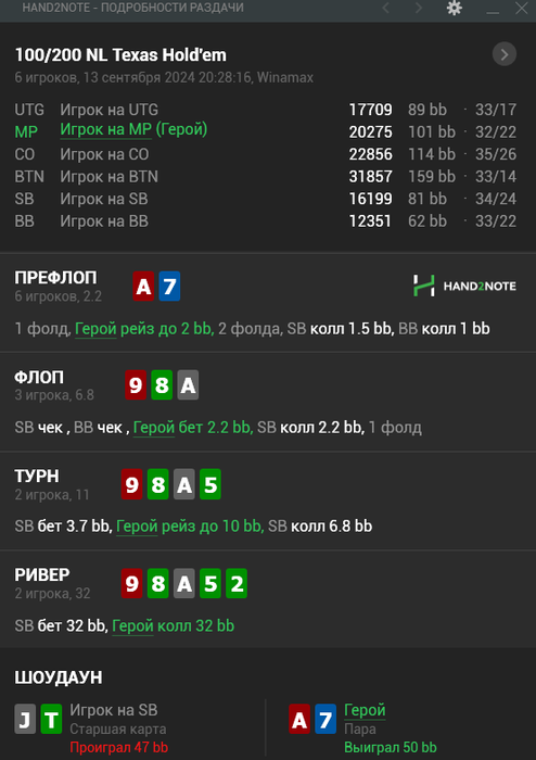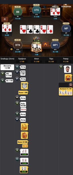 5. Фолд на пуш в мой бет ривера. Как однажды сказал мой тренер(отличный игрок и прекрасный человек- вдруг прочтет случайно))) Хороший игрок в покер умеет выбрасывать сильные руки. Учусь и я.