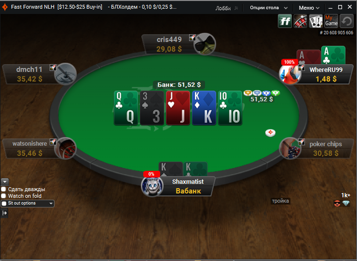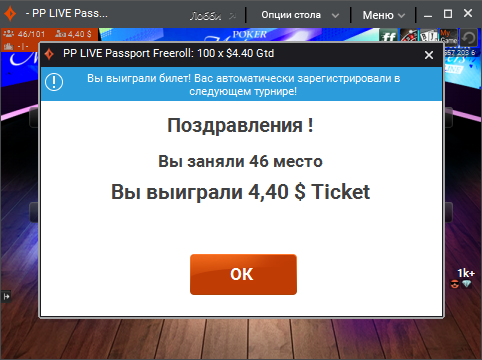 2) Poker Match --> 43.95 ₴ ( + 28. 97 ₴ ) На покер матче сложилась печальная ситуация мог иметь и выше БР. В трунире карапузик при 34 челах в призах (на момент олл - ина было 41 человек я имел 14 стек) принял чувака с AA<QQ ривером доложили Q, за первый стек очень обидно(((. А это еще если что вход 5 ₴ + аддон 10 ₴. Ну ничего будет и на нашей улице праздник.