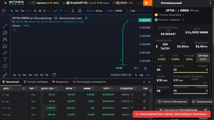 Я быстренько продал свои мемкоины (оставил только Floki) и перевел 100$ на кошелек. Но дальше что-то пошло не по плану. У меня все никак не получалось приобрести токен - банально не прогружалось количество монет, которые мне выделят в обмен на BnB. Я около часа сидел у телефона в готовности нажать на заветную кнопку обмена, но платформа заглючила в край, даже другие криптовалюты не прогружались. До сих пор не понимаю, почему интернет так себя повел. Но во время ожидания я стал читать про токен (что надо было делать до покупки), зарегистрировался в дискорде компании, посмотрел ликвидность запущенного токена (который почему-то при огромном ажиотаже набрал всего около 300 тысяч долларов за 2 часа.