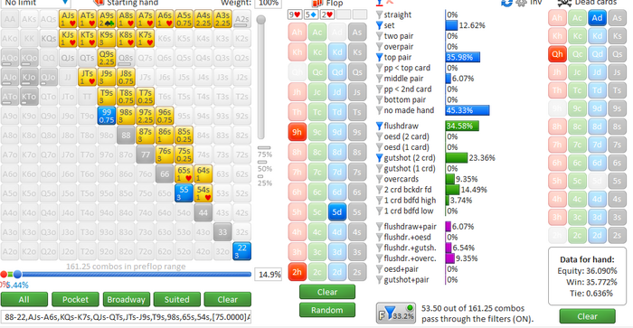 Чот подзабил в ФЗ примерный диапазон рейза оппа и получилось, что Aqo имеет 36% эквити против его диапазона, - колить получается явно убыточное занятие. Даже если убрать топ пару из рейза, эквити 42%, на колл флопа хватает, а вот на тёрн уже нет.