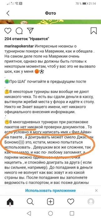 Такой себе хобби-фиш хай-лимитов, ну наконец-то всё стало на свои места)). Ну тогда конечно - могла! по незнанию могла рекламировать!)). У неё еще и 100% ИТМ в оффлайне, судя по формулировке : ""за КАЖДЫЙ турнир". Тогда ладно, раз 100% винрейт у девчульки, а она по африканским оффлайнам гоняет - бред какой-то, какие подсказчики? Надо сразу доли на WSOP ебашить - 100% же ИТМ, ребята, такой хабар грядёт!). А там же ещё мужики все за столом - ну ВЫ поняли,да? - как в ИТМ не попасть, все пихают в неё что-то, недооценивают. В общем, я считаю,что девушку надо перестать гнобить и скинуться ей на Вегас и поселить вместе в хайроллерами, так как в той статейке еще и личная жизнь никудышняя, а в дневнике черным по белому написано, что и вовсе человек без секса живёт.