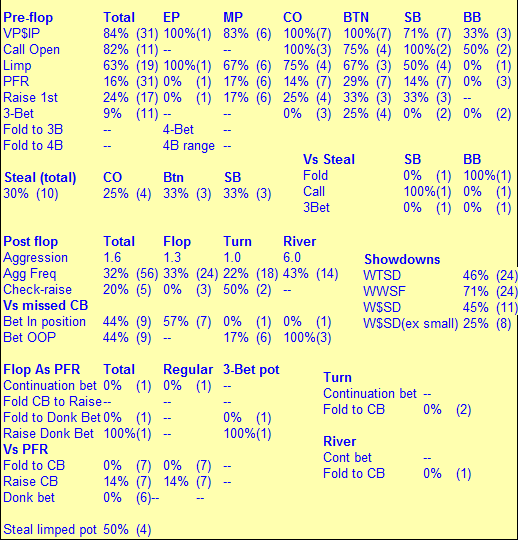 45. думаю все верно. Только скорее всего A6 думаю надо исключить. Можно добавить 33. + возможен всякий шлак типа 65s. В любом случае выставление будет плюсовым. Для таких случаев нужны нотсы... 46. Без нотсов тоже тяжко что-то сказать. По статам видно что оп мувит на ривере. Возможно конечно к риверу он натягивал часто. Но судя по WWSF WTSD W$SD думаю надо колить. 47. J думаю можно исключить. Не поставил флоп, поэтому не известно есть там скажем 99 или 7. Но скорее всего пары там тоже нет. Но судя по статам оп не муверный. Думаю фолд на таком ривере. 48. все отлично. стоим на голову старше, и лучше выставиться на терне, чем сыграть кол и по риверу если закроется флаш или стрит тебе фиг заплатят. 49. Сделай стат фолд 3бет по улицам. J там мало - JJ и возможно JTs. Все остальное улетает после твоего 3бета. Думаю ставку на велью надо делать.