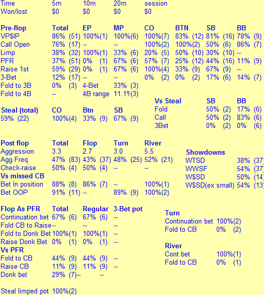 Вчера банкрол наконец позволил опять сделать вылазку на полтинник. Результат конечно предсказуемый (-2 стека и обратно на нл20), но попытка как говорится....