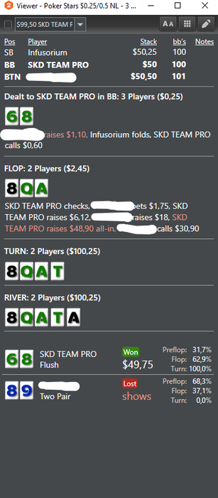 Теденция поля в приложухах очень сильно отличается от Звезд. На Звезды я вернулся на прошлой неделе и сентябрь планирую отыграть НЛ25, чтобы привыкнуть к игре с ХМ, понять общие тенденции поля, а уже в середине октября на рабочий лимит. Буду биться на НЛ50, так что со всеми увидимся за столами)