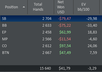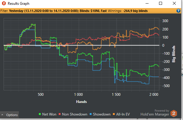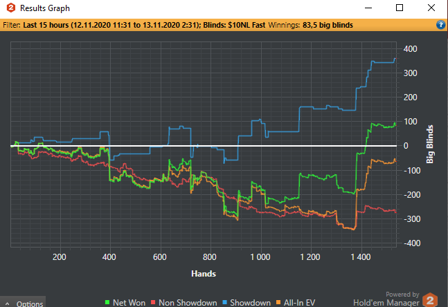 Диспа ебашит меня дальше, НО. Посмотрела как играет ББ против Батона. В этом месяце -33бб/100 на 640 семплов. В прошлом месяце на 420 было -65бб/100. По крайней мере игра на ББ налаживается, значит не зря в ФЗ сижу каждый день. Это радует)
