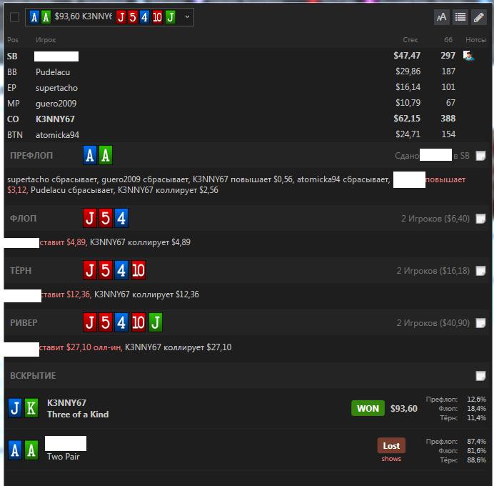 Все шло нормально, меня в целом устраивала игра (грамотно фолдил, не блефовал где не надо), не смотря на то, что я, как узнал позже, ковырялся где-то в нуле. Но тут случилось это: катаю уже где-то в районе 2800 раздачи (на 4 рег.столах), очень сильно хочу в туалет, но за столом хороший любитель сидит и я тянул до последнего. Собираюсь уже ставить столы на паузу, но получаю ДОЛГОЖДАННЫЕ АА, дал 3бет и абсолютно наплевав на текстуру доски, вгрузил свои 300бб тремя баррелями. Тем самым оформив самый большой проигранный банк