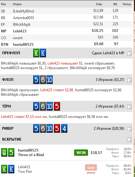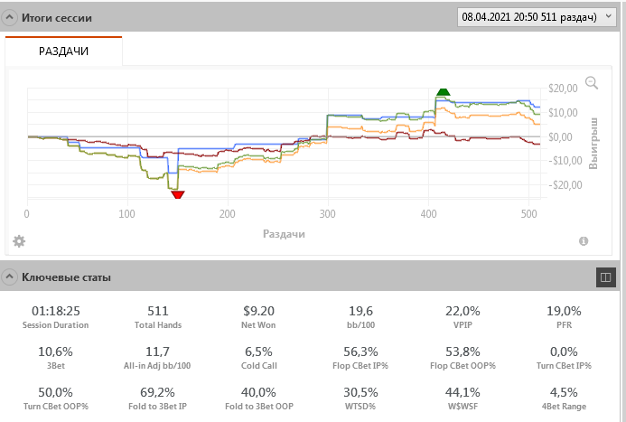 Опп 18/15, Опен БТ 39, Фолд на 3-бет 59, 4-бет ренж 4, Фолд на КБ 44/50/-, Бет в пропущенный в 3-бет поте 32/79/33, Агрессия 41/31/28, WWSF45 WTSD25 WSD(big)61