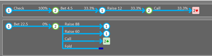 Типо по 2 сайза рейза 60бб и 88бб, после каждого из них еще строится дерево между пушем и коллом, которое еще потом на 15 деревьев на ривере разбивается. Что за жесть? Нельзя просто как в симпле сделать, алын, если % от стека равен банку? Тут только либо так, либо есть возможность выбрать только алын и больше ничего, если спр подходит к единице.