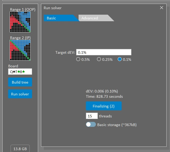 Почистил всю систему от лишних задач, запущен был только солвер, даже браузер закрыл. Открыл СФП и ГТО+ (считал конечно не одновременно, а по очереди), забил одинаковые доски (QsTc8c), одинаковые префлоп ренжи (BBvsBU cash 100bb), одинаковые постфлоп сайзы: