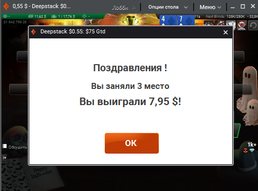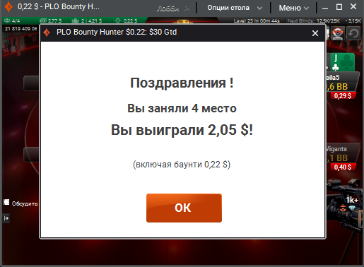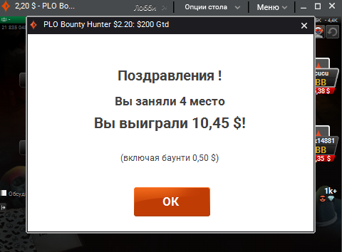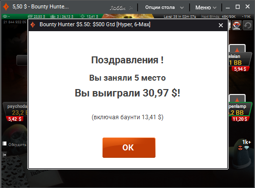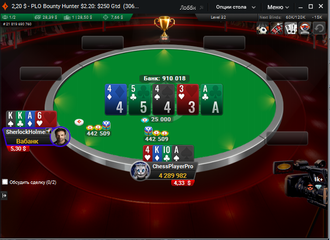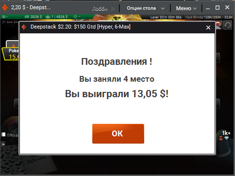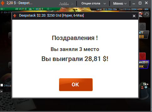 Браво! Я это сделал наконец! Вышел на финалку 4 из 7 все шло более менее, в 4 макс был к сожалению 4. Туда сюда как итог получаем 3 - max после часа игры в стэках 20 бб + В 3 макс я раскручиваюсь и вырываюсь в топ 1 по стэку но с минимальным отрывом и потом в течении 5 раздач улетаю так что у меня остается стэк 3,5 бб у оппонентов 31 и 33 бб. Вышел я в 3 макс всего с 1 нокаутом Далее я делаю просто невозможное вырываю 2 олл-ина важных и тут начинаю просто играть более жестко прочитав оппонентов. В первую очередь я выбиваю чипака и получаю перевес в 4 к 1.