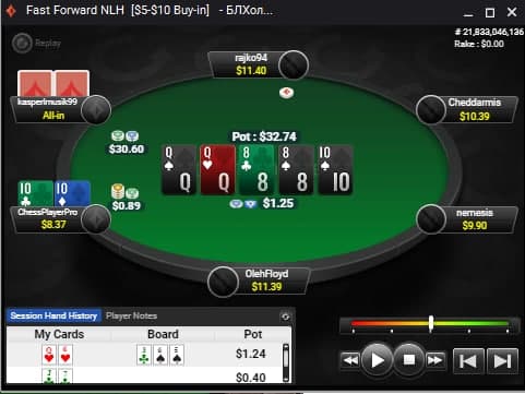 Я бросаю данную гонку нл2 и врываюсь на нл5, буквально час и я отбиваю 20 $ но потом начинается просто лютая дичь. Я сразу планировал что каждый час я буду перезаходить со столов что бы отмыть бабло. Как итог к 18.00 в моей кассе остается 30 $ из 80 $. Сыграв 2 спина по 5 $ где я люто наращиваю стэк и потом меня выносят каратыши первый с 4 бб вытащив 3 олл-ина подряд и во втором приблизительно все проходило так же, я принимаю решительный ход и иду в Алл-ин Фолд на 16 $ жду свою карманку 3 3 и уже с огрызком в 15.8 $ запихиваю и меня откалывают 2. С флопа я получаю СЭТ и сразу закрываю клиент сделав еще круг. Как итог вот что у меня есть.