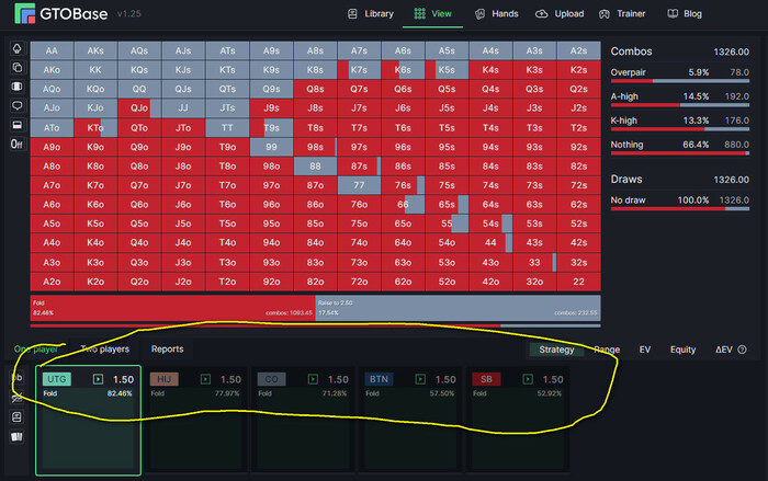 Подскажите, что за ерунда происходит у меня уже несколько дней. Открываю библиотеку 6-макс решений, и она выглядит как на скрине. Проблему обвел желтым карандашом в нижней части скрина. В итоге не могу построить даже дерево на префлопе, потому что для каждой позиции доступна только опция фолда.