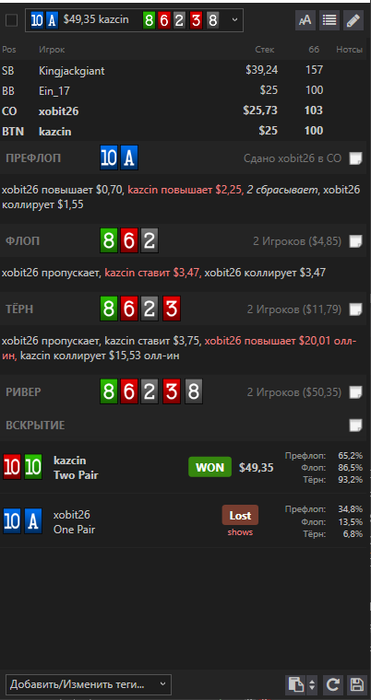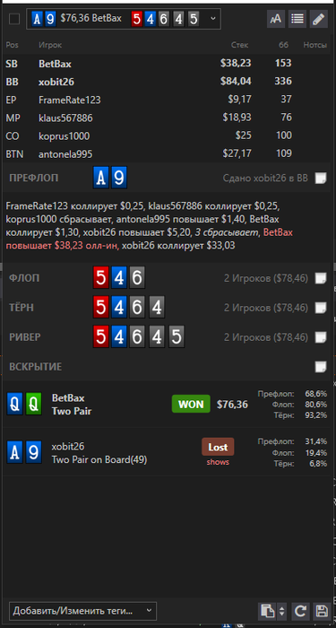 julik27, солвер, конечно, тут надробит скорее всего как всегда, но против фиша и с регом в поте протект против Ах рук нужен. А половить блефы от фиша можно с терна будет, когда у рега "Axs" выбьем. А фиш с терна их превращать все равно часто начнет с такой статой. Если уж и чекать, то только АА, которые неуязвимые к выходу оверкарты. А дамы\валеты тоже бы от чека играл?