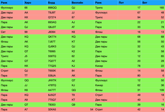 Если кратко, выигрываю в основном, где добираю ривером. Где ставлю блокбеты, там благополучно на это забиваю и благородно отдаю лишние фишки оппонентам. Надеюсь, эта нудная двухчасовая работа по составлению таблиц вручную поможет мне больше так не делать.