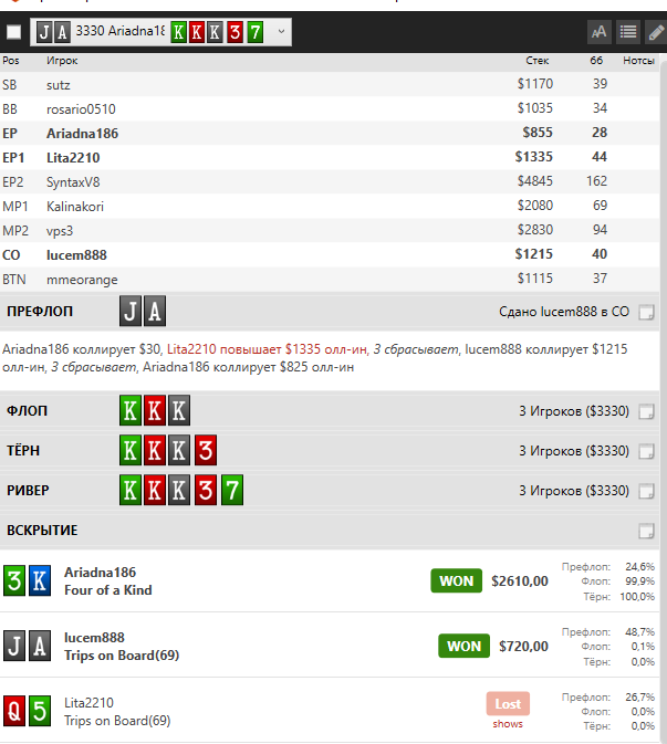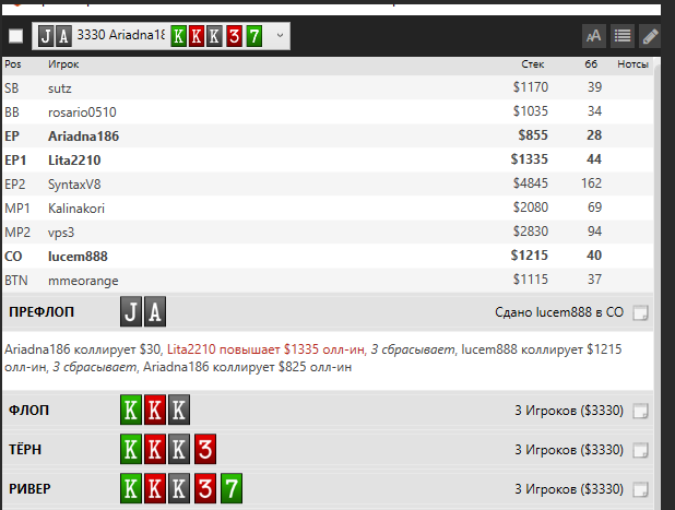 Я имею ввиду в будущем К3о на префлопе не рейзят с бб в оппа, а трибет к примеру будет смотреться в блеф, эквити у этой руки ничтожно мало. И попадая в пару, мы почти всегда позади. Эта рука годится только для стила. И то надо убедиться что оппы умеют фолдить свой мусор.