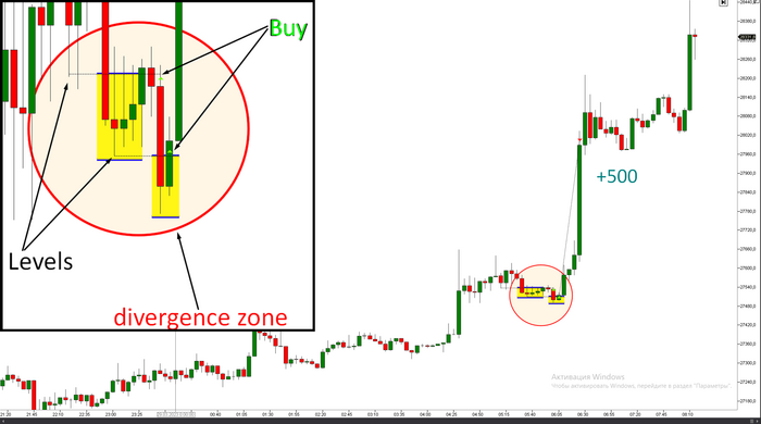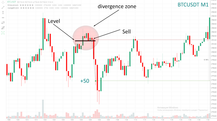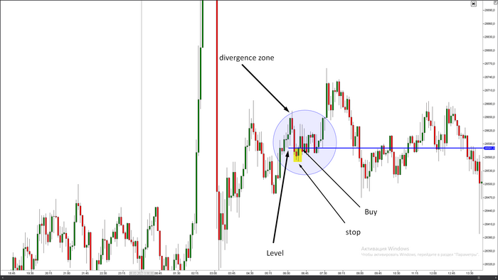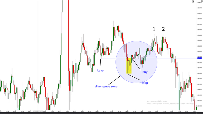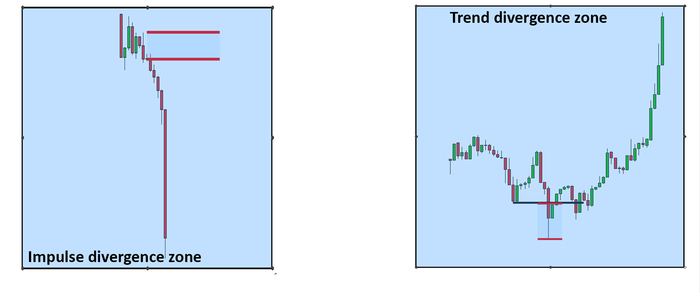 Классификация дивергенций. Есть два вида дивергенций; импульсная и трендовая. Разница между ними заключается в том что при возникновении "трендовой дивергенции" я ожидаю ложный пробой относительно какого-то уровня. Когда возникает "импульсная дивергенция" вхожу в операцию после закрытия текущей свечи, не ожидая ложных пробоев.