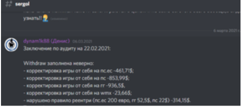 Но потом он видимо решает продавить меня и всю команду, т.к. у него была зацепка из созвона с аудитором и он понимает, что я могу пойти даже в этом случае на встречу игроку, т.к. реально был косяк аудитора.