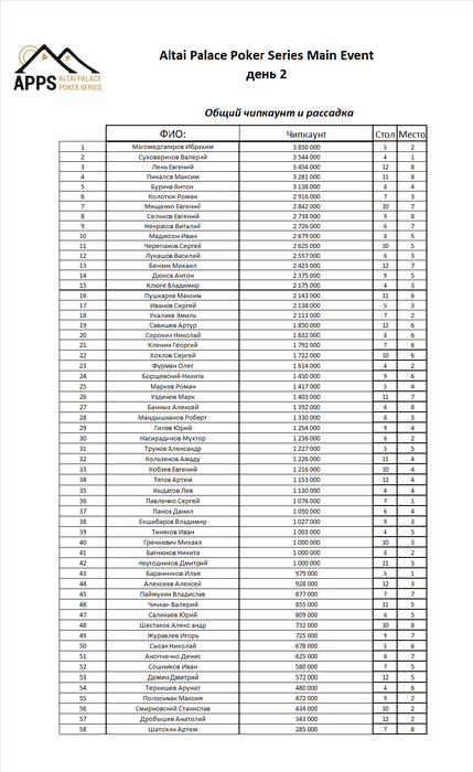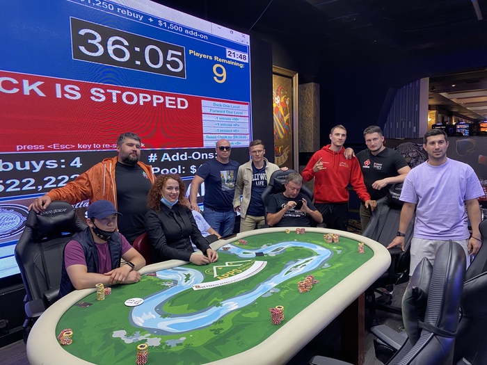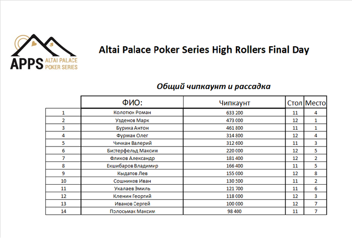 Долго ждать не пришлось, вот вам финальный стол и примерный чипкаунт