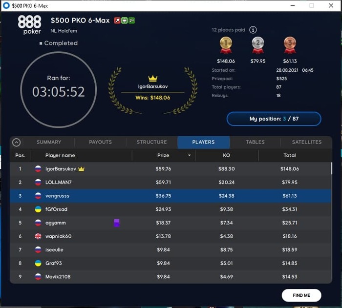 Оппоненты среди этих 28 были, мягко говоря, не очень сильные, что позволило мне, с определенной долей удачи, взять топ 1 и $351.77 призовых.